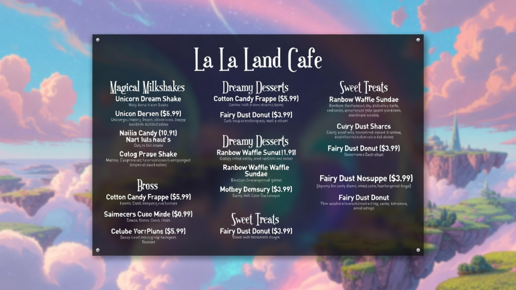 The drinks on the la la land cafe menu are super fun and full of sparkle! You can get a shiny lemonade, a milky rainbow drink, or a frothy pink latte. Some drinks come with glitter on top or even little marshmallows. The best part? Each one looks so cool in pictures! These drinks are not just pretty—they taste great too. Some are sweet like candy, others are fresh like fruit. There’s even a cold brew for coffee fans who want something special. These happy drinks are perfect for a sunny day or to cheer you up when you’re feeling sleepy.